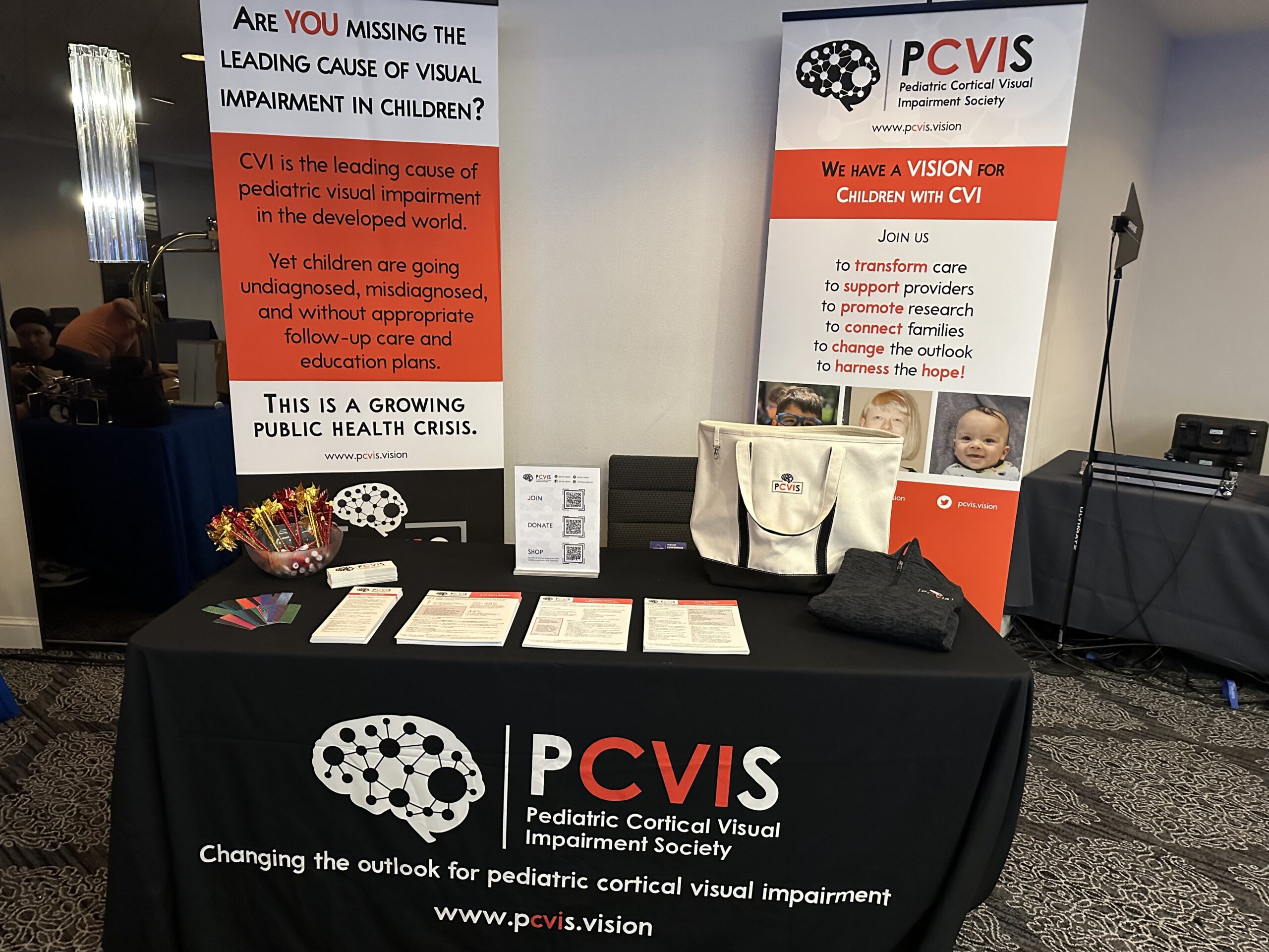 PCVIS members gather around a pop-up sign used to help spread awareness about CVI at conferences and events.